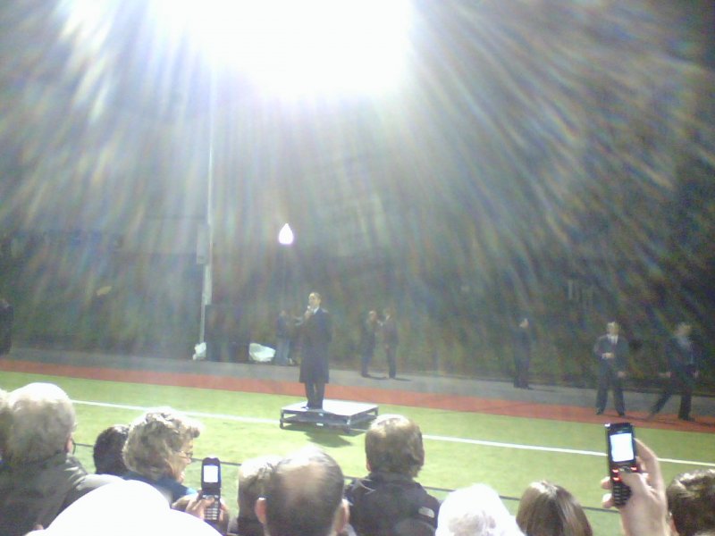 This event was the big thing in town tonight, and with the arena having a capacity of 9,000 or so, I knew we would not get in. People had been in line for hours waiting to see him. I am all for it though, even if it meant we just have a nice walk across campus holding hands. Well, we park the car and walk about 10 minutes only to find a line of thousands. We walk past the rec center, the soccer fields, Hayward Field and finally come to the end of the line. We realize we won’t make it in, but let’s just wait until someone says its full. Keep in mind, this event is free. About two minutes later, groups of people are walking past us, saying the arena is full and we should head to the overflow area to hear him speak in 45 minutes. We following the small groups heading to the overflow area (the back of the arena) where we end up standing about 7 or 8 feet from a barricade. Speakers are playing the opening acts for the event. These are state politicians speaking inside the arena, but no one outside is really listening.