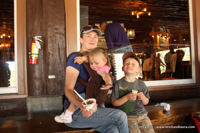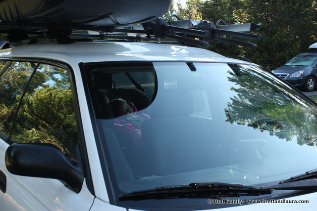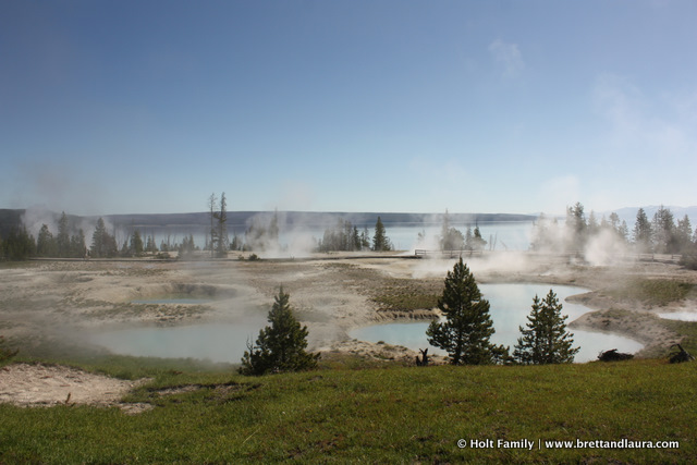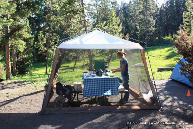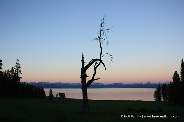 Day 8: Up and at ‘em Autumn told us with a loud wail at 5am. No one was ready to get up, especially the rest of the campground. Laura and Autumn were up a lot the night before so rather than fight this 5am wake-up call, I loaded her in the car and went for a drive along Yellowstone Lake. We returned around 7am. Autumn stayed in the car and slept and I prepared breakfast for everyone.