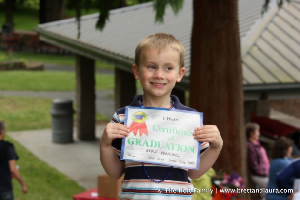 Ethan graduated from preschool today. It was a bittersweet moment watching our little guy leave the school, teachers, and friends he enjoys so much. He has grown so much and his preschool has had a tremendous impact on him. The school has always supported the values we hold in our family: treat others with respect, share, help each other, each child is unique and, therefore, encourage them down their own path. Even today as he played with the children, he demonstrated his caring attitude as he was protecting the girls from the boys, especially the one with a bow and arrow.