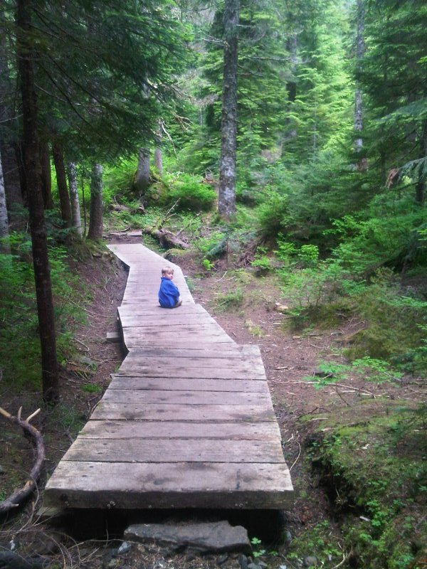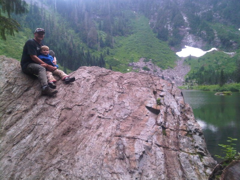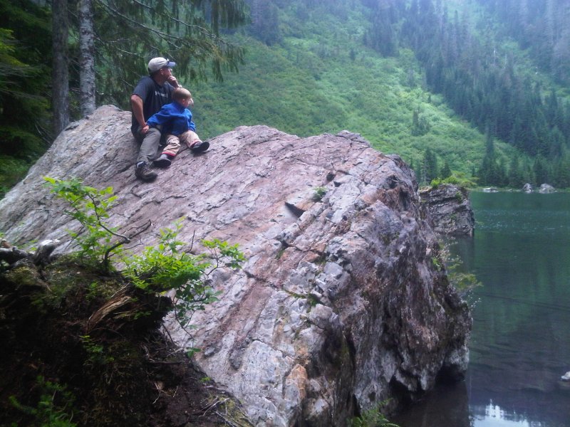After completing the middle section of the logging road, the second mile becomes a bit more challenging. The trail is heavily used and eroded from rain runoff. There are a lot of exposed roots and rocks, some wet, making it difficult for Ethan to maneuver some areas. On a couple steps he would put his hands on the ground to make the step up. There were areas we had to hold his hand or just carry him. After a series of stops to allow him to rest we made it to the lake in about 2.5 hours.