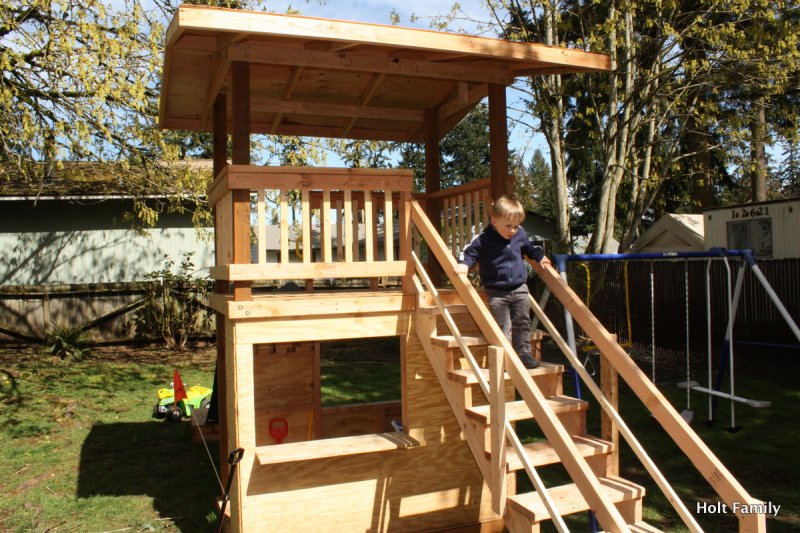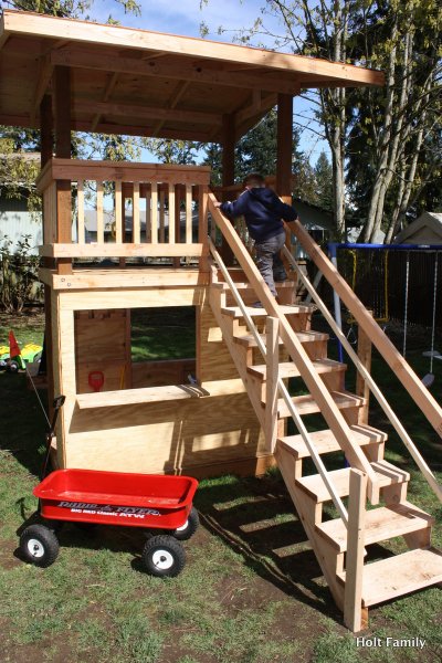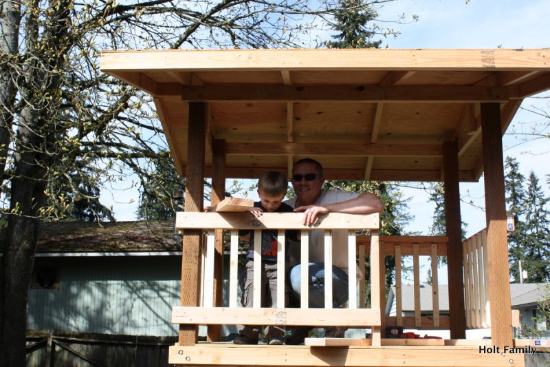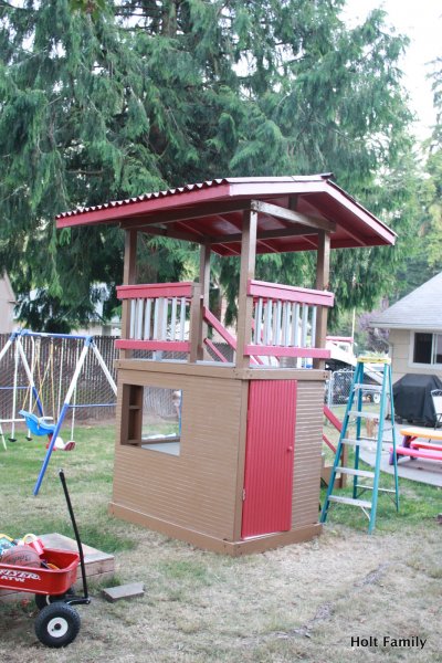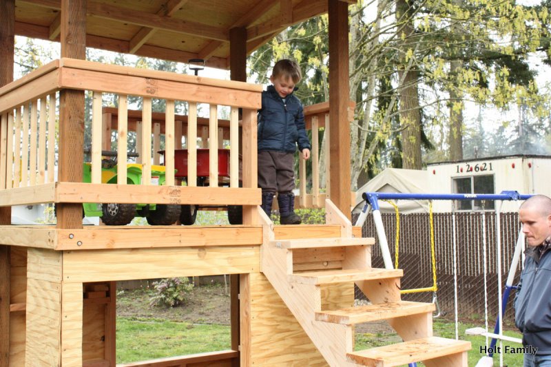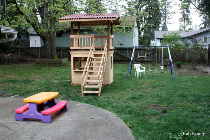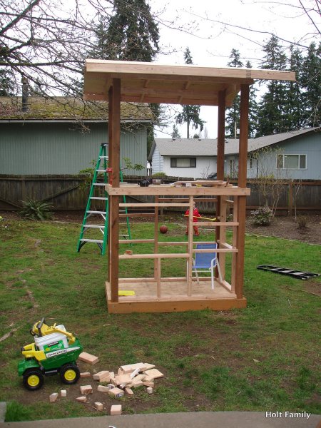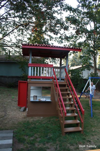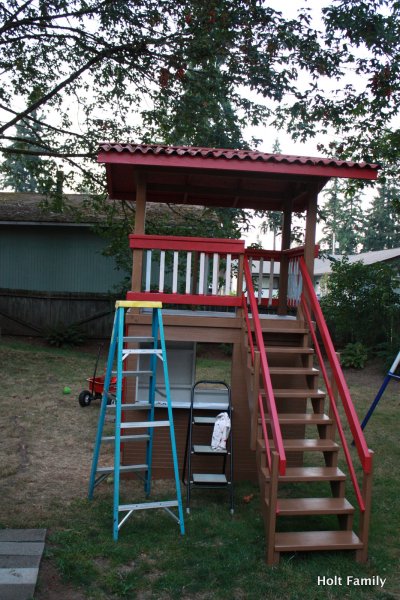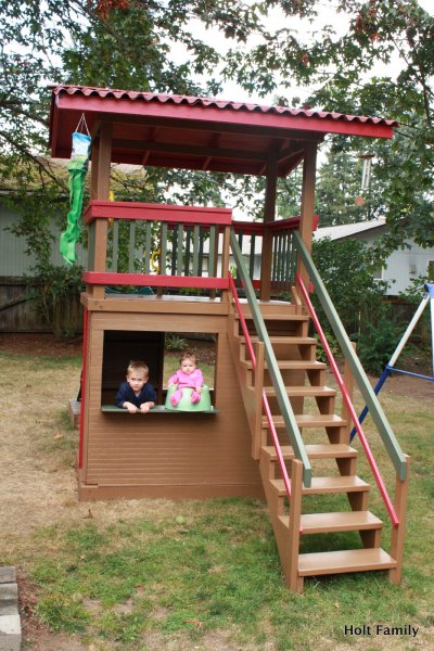 The first piece of lumber was cut a week before Autumn was born (March 18). Much progress was made those first few weeks as the frame was put up. A couple weeks later, the stairs were built, and accessories added on. The red roof was added in May and then we stopped.