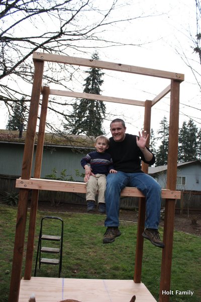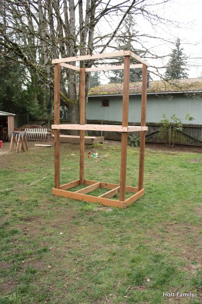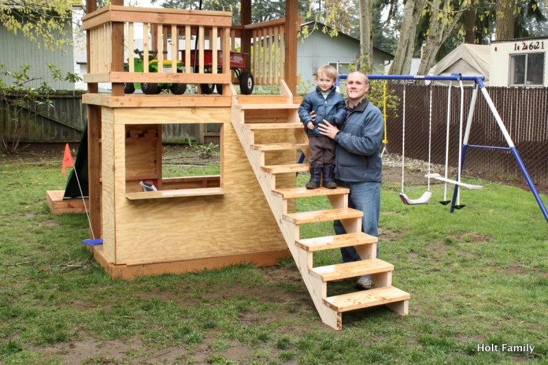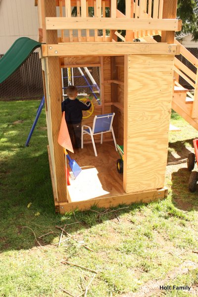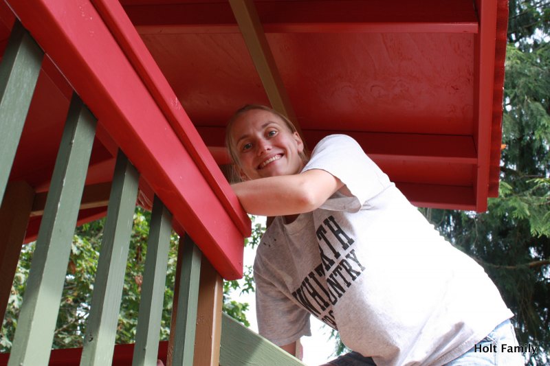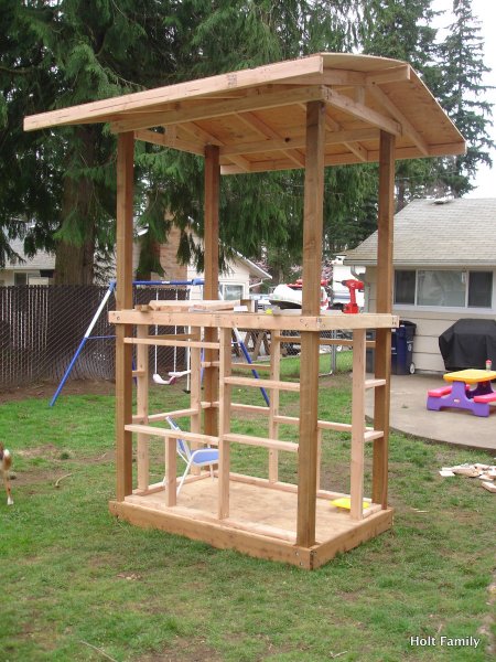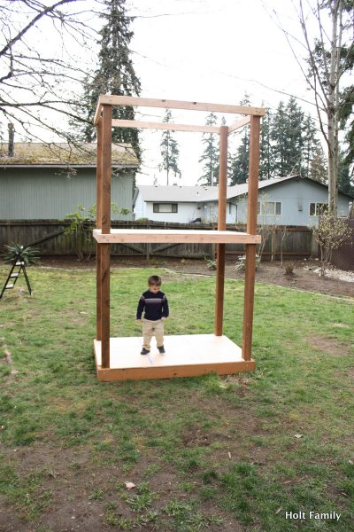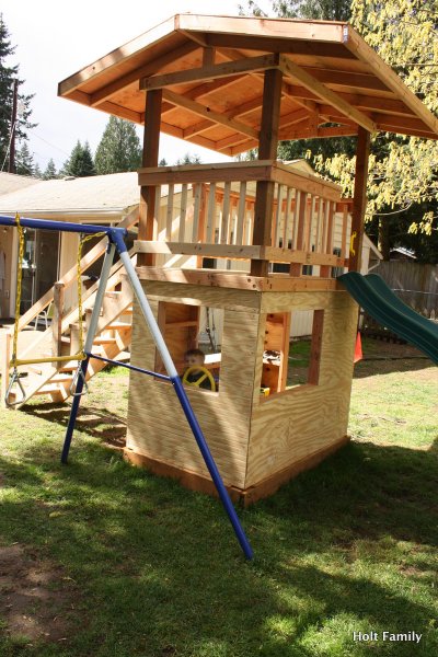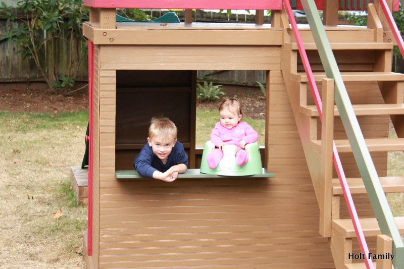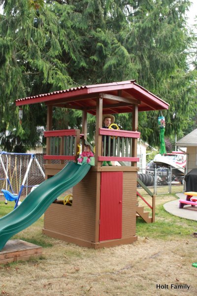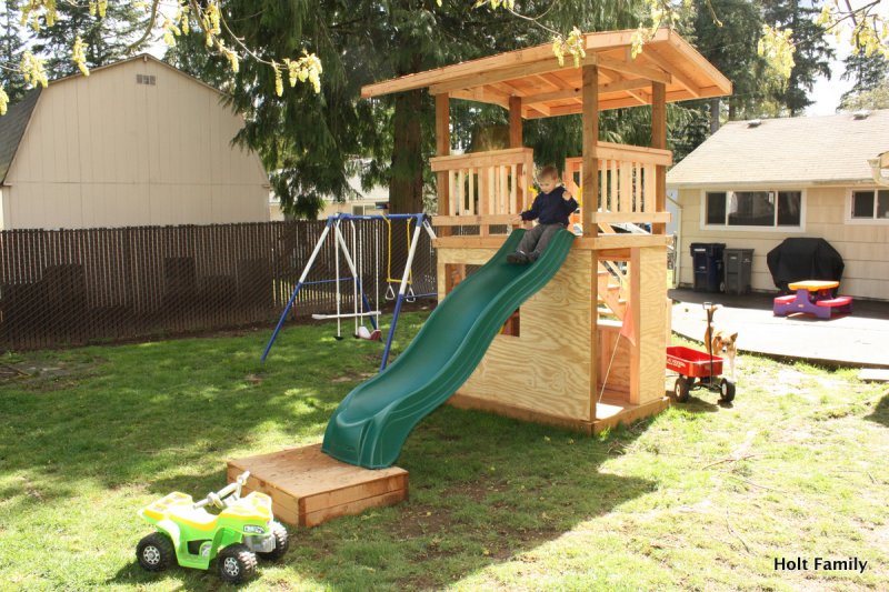 The first piece of lumber was cut a week before Autumn was born (March 18). Much progress was made those first few weeks as the frame was put up. A couple weeks later, the stairs were built, and accessories added on. The red roof was added in May and then we stopped.