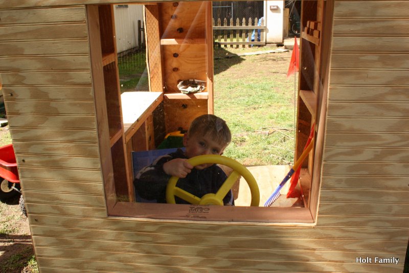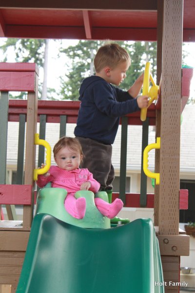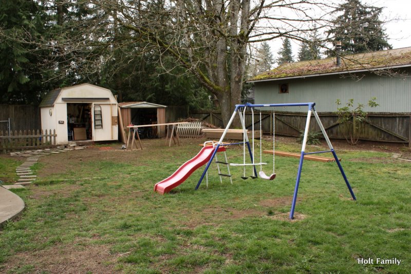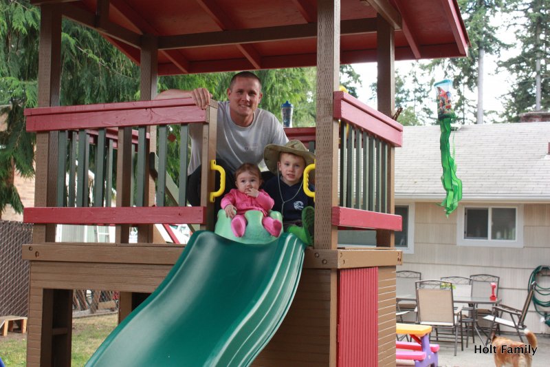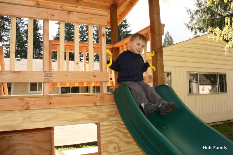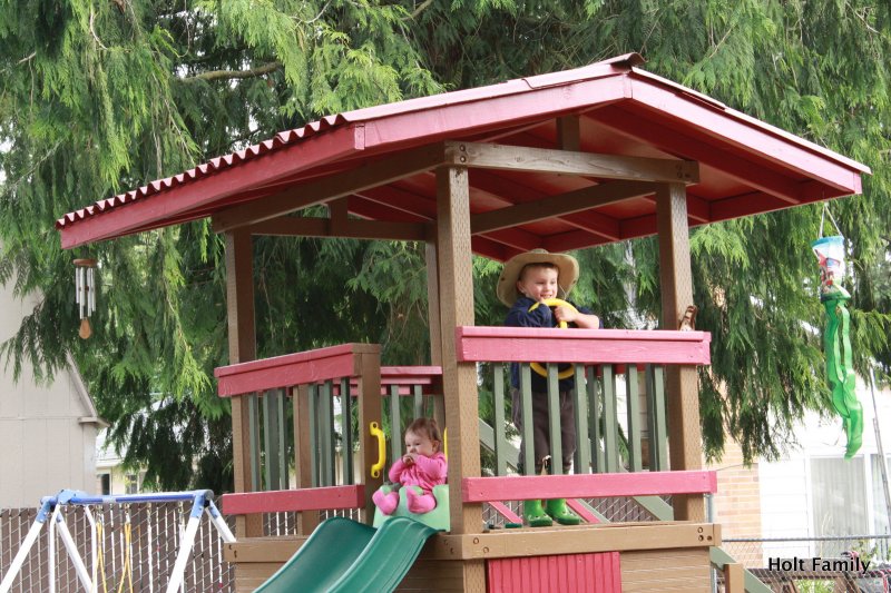 A late May windstorm almost took out the slide when a large branch from our maple tree came crashing down the slide. While it pancaked the slide, the slide was able to form back to it’s original shape and save from another $150 slide. In July we started back up again as we put on a door (Ethan’s only request for his playhouse) and we completed the project with our painting in August. There are few minor touch-ups we have to do, but otherwise, it’s good to go.