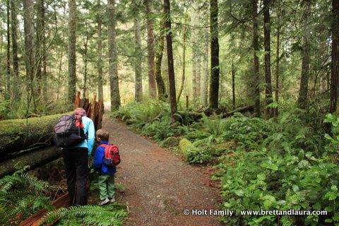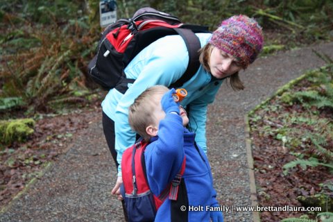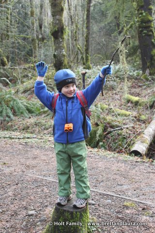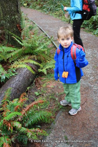 Tiger Mountain Hike at Tiger Mountain State ForestFor this hike Ethan wanted to wear his backpack loaded with his binoculars, compass, rain jacket, and water. He was very excited for this expedition and wanted to be prepared. Throughout the hike he enjoyed looking for wildlife with his binoculars. Of course every time he tried he always said he couldn’t see anything out of the binoculars despite our best efforts to focus his eyes. We’ll keep trying. He also tried fishing with his “fishing pole”  or stick of the day. On every hike we take him on he finds a stick or five to carry along or share with us. At the end of the hike he’s required to leave them at the trailhead so the animals can use them.
