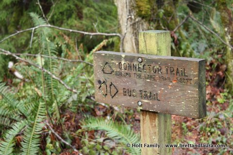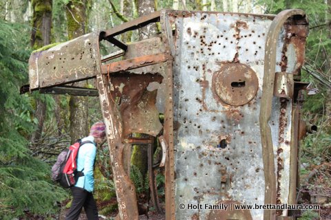 Tiger Mountain Hike at Tiger Mountain State ForestAnyways, we decided to hike on one of the many family friendly trails from High Point Trail Head that offer flat terrain for Ethan to easily hike. There are plenty of strenuous hikes around and up the mountain for those seeking a more challenging hike. We started on the Around the Lake Trail then came back on the Bus Trail. Both trails provided about 2 miles of hiking  which was plenty for Ethan. There were interpretive signs along the Around the Lake Trail that provided some great teaching moments for Ethan. He now knows how to identify a Western Red Cedar. An unusual site is found on the Bus Trail where an old bus lies on it’s side. It’s been there for decades and has been visited by plenty of bullets. Ethan found it very intriguing and wondered how it got here. His one theory is that the bus driver died and the bus was now stuck. Hmmmm.